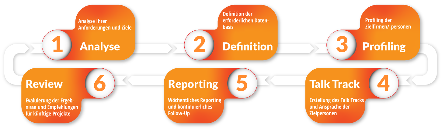 Durch strukturiertes und planvolles Vorgehen stellen wir den erfolgreichen Verlauf Ihres Telemarketing-Projekts sicher: